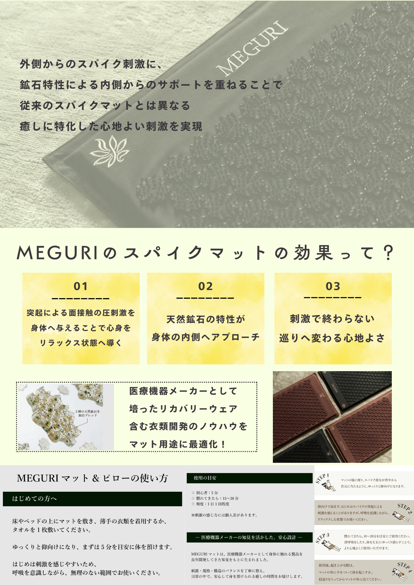 リカバリーウェアなどの医療用品に用いられる鉱石がスパイクに内蔵されたことにより、スパイク刺激だけでなく身体の内部に鉱石の効果をもたらすことで本来のスパイクマット以上の効果を得られる商品です!
